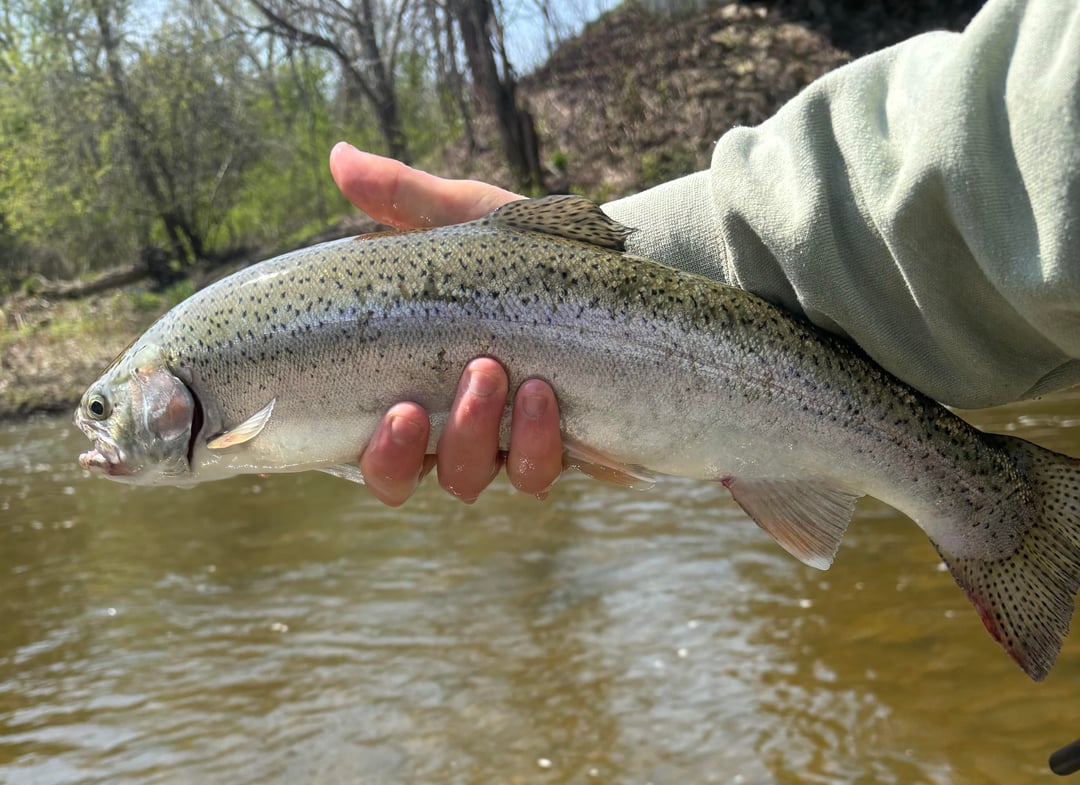 Double nymph rig; size 12 tungsten beadhead jig pats rubber legs type stonefly as the top fly, size 16 tungsten beadhead jig mc foam egg in peach as the bottom fly. Both barbless. also switch out the pats rubber legs for a size 12 waltz worm and got a few.