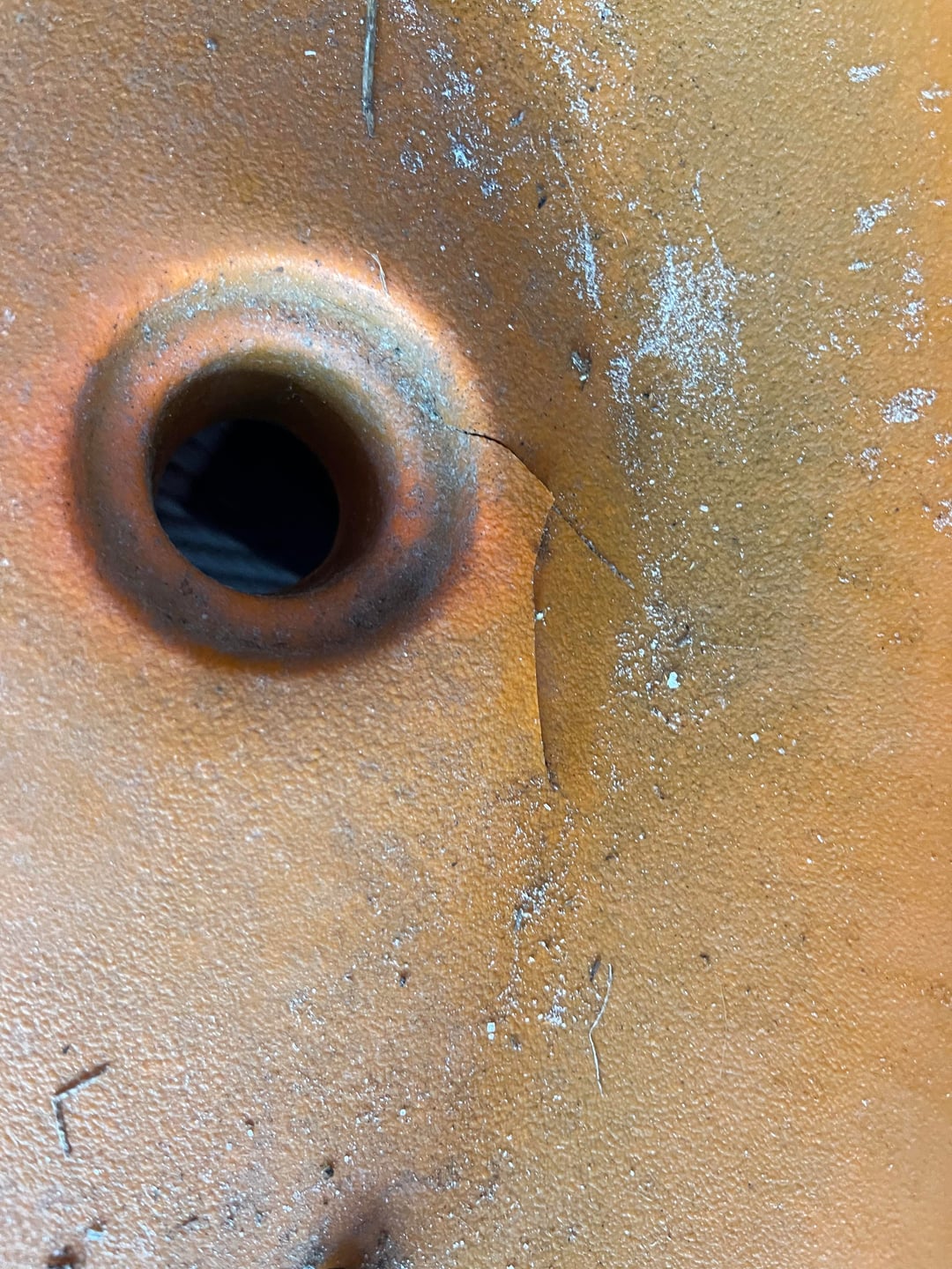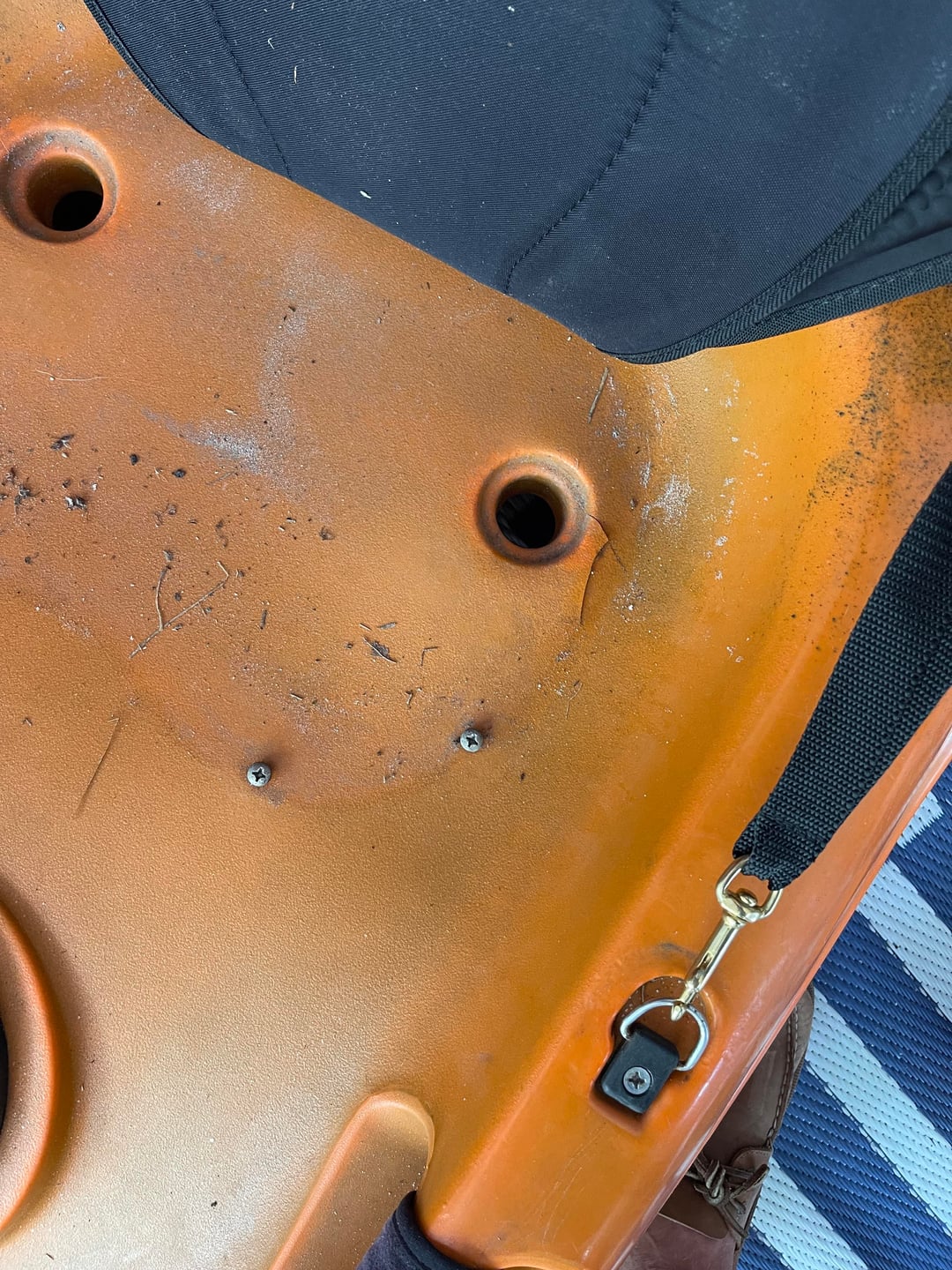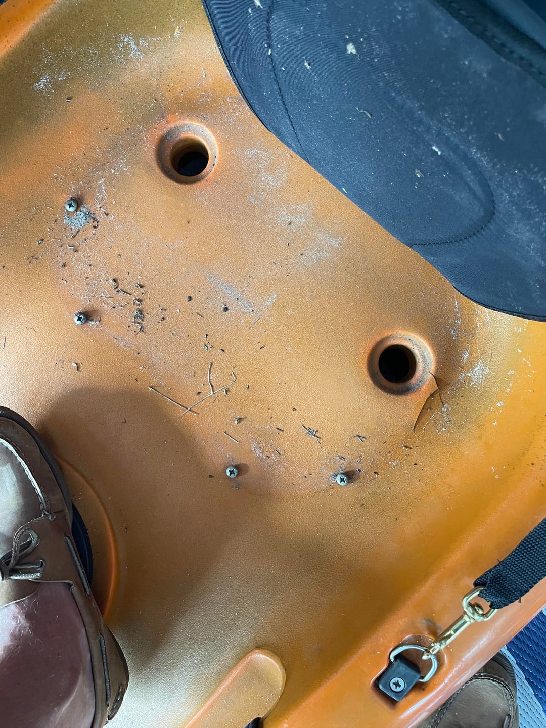 Have you noticed that you have to drain your Yak after every trip? That is awfully close to your scupper. Do you have access to the interior? If those are the only cracks, you could use some Yak welding. Do you have any plastic from drillings or cuttings? (FYI…I keep a 4oz cup fulla drillings and cuttings)