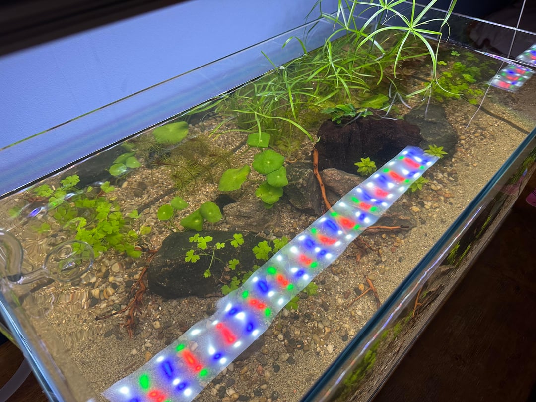 CO2 – Pressurised system using SodaStream adaptor (very light about 0.3bps) 8 hr day, 1 hr before lights on/off