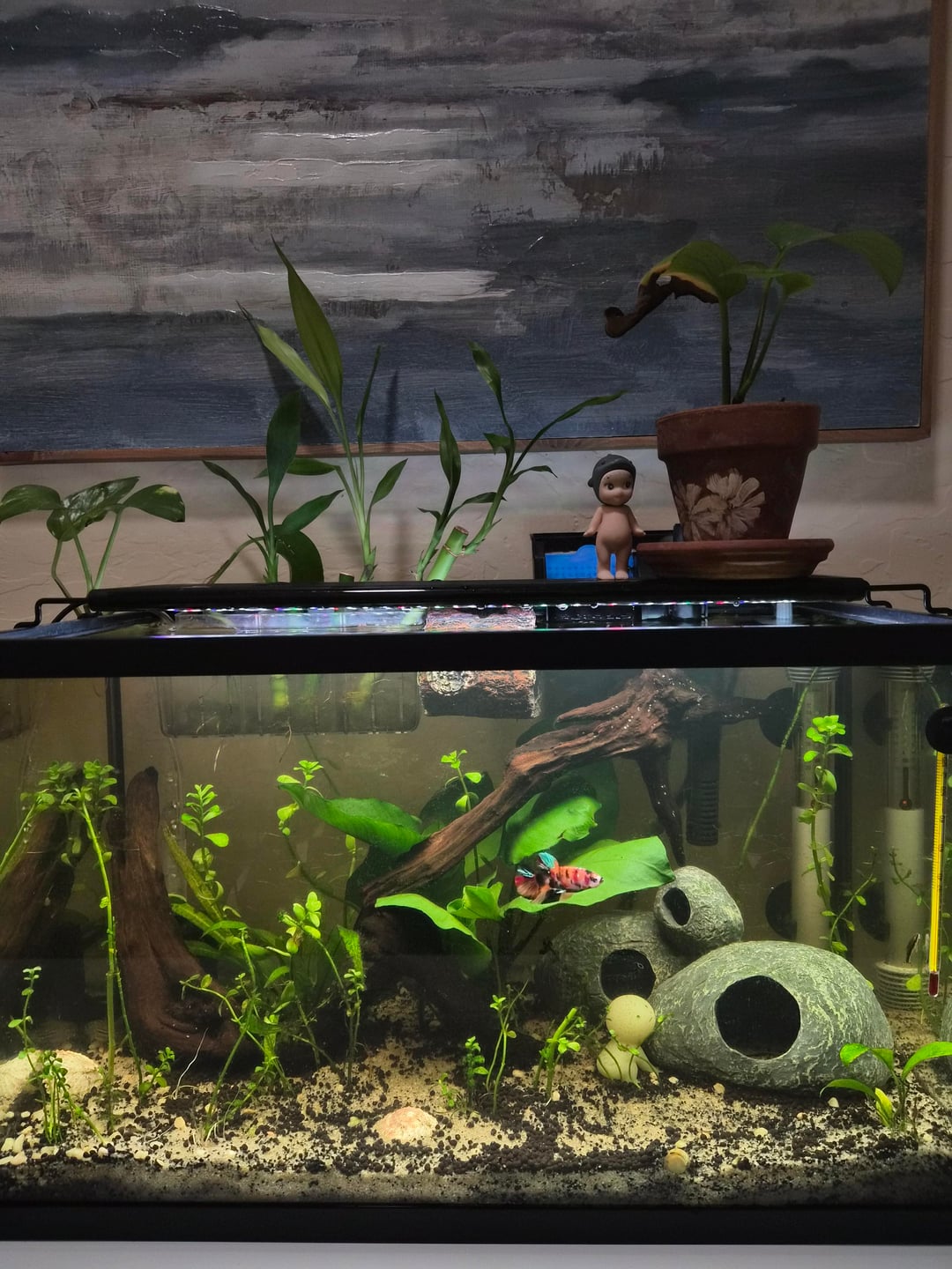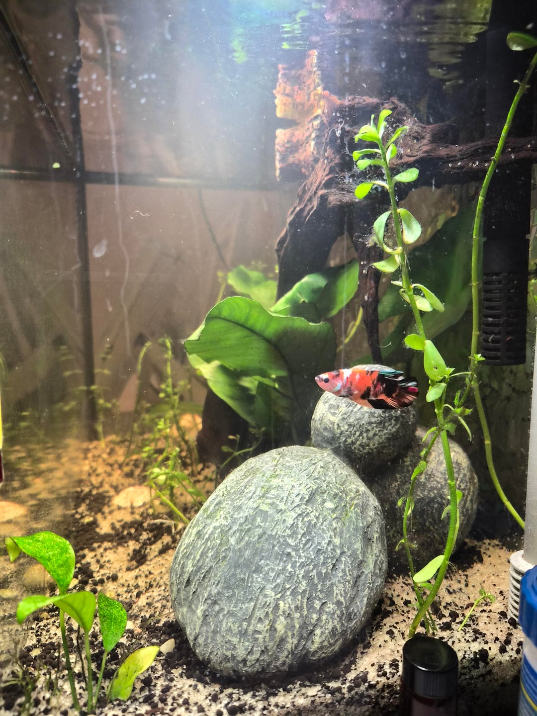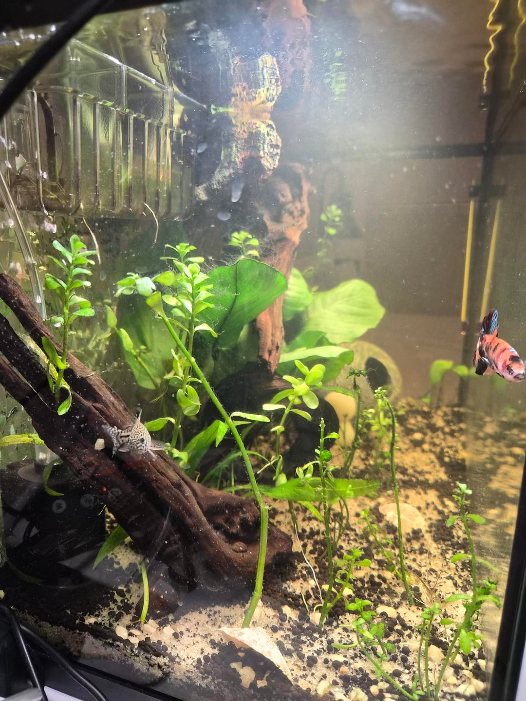 elf_n_safety on April 27, 2026 6:07 pm Pretty! Like the decor/planting. Betta should be happy. Honestly I would lose either the corys or otos and increase the school size of the one you keep to a minimum of 6 of the same kind