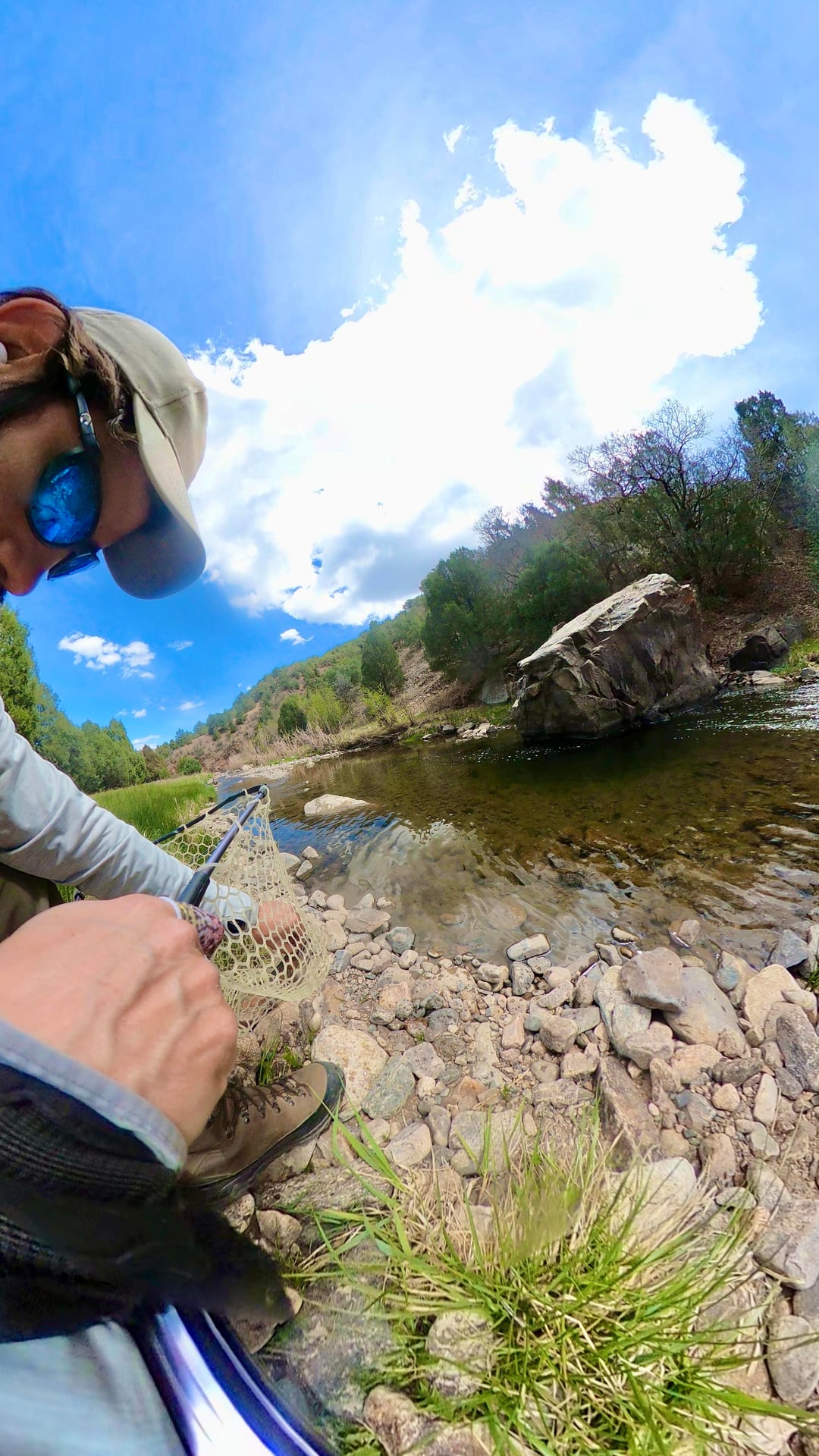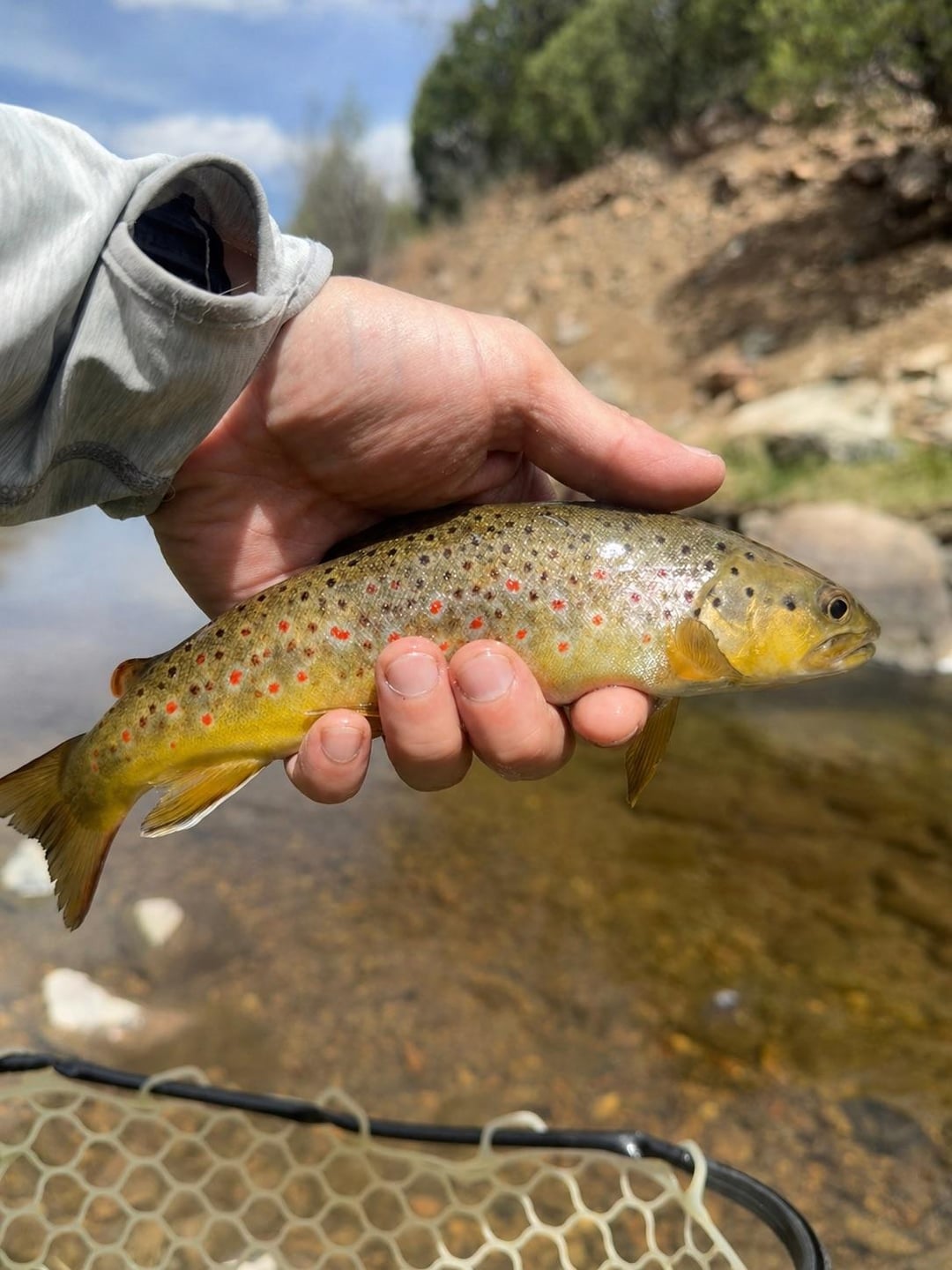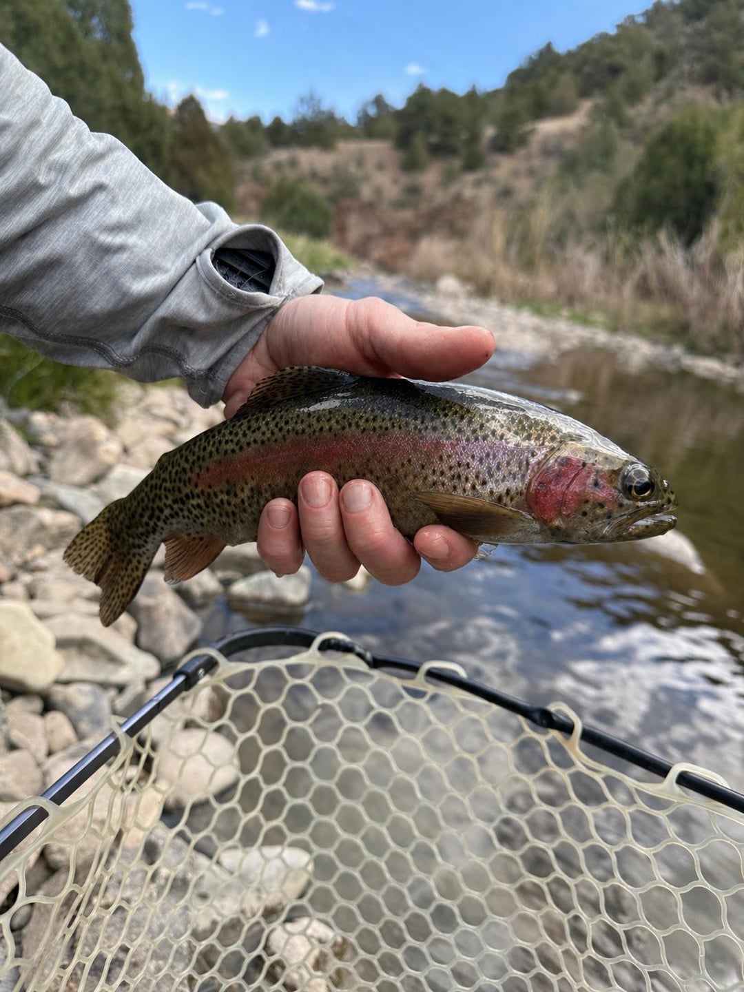 Went to two bodies of water Sat. It was a slow, but beautiful day. The reservoir crowded with musky and shore fishermen with lines in water. Maybe next time — they got it covered. Went for a river walk, and found it teaming with rainbows and browns, and got a couple of each from under rocks.