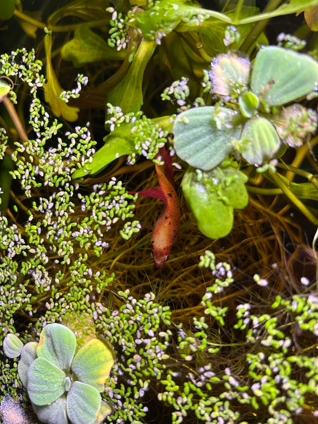 now my other two Betta fish have tumors. One of them, Cupid, who lives in a 17 gallon planter pot because God forbid she’s next to glass and she goes crazy on her reflection. I can only see her from the top so I didn’t notice the massive tumor on her bottom side. Since it grew slowly, I also didn’t notice the pop eye she had developed. I recently got her a betta tower so she could see up out of the pond, that’s when I noticed the fin rot.