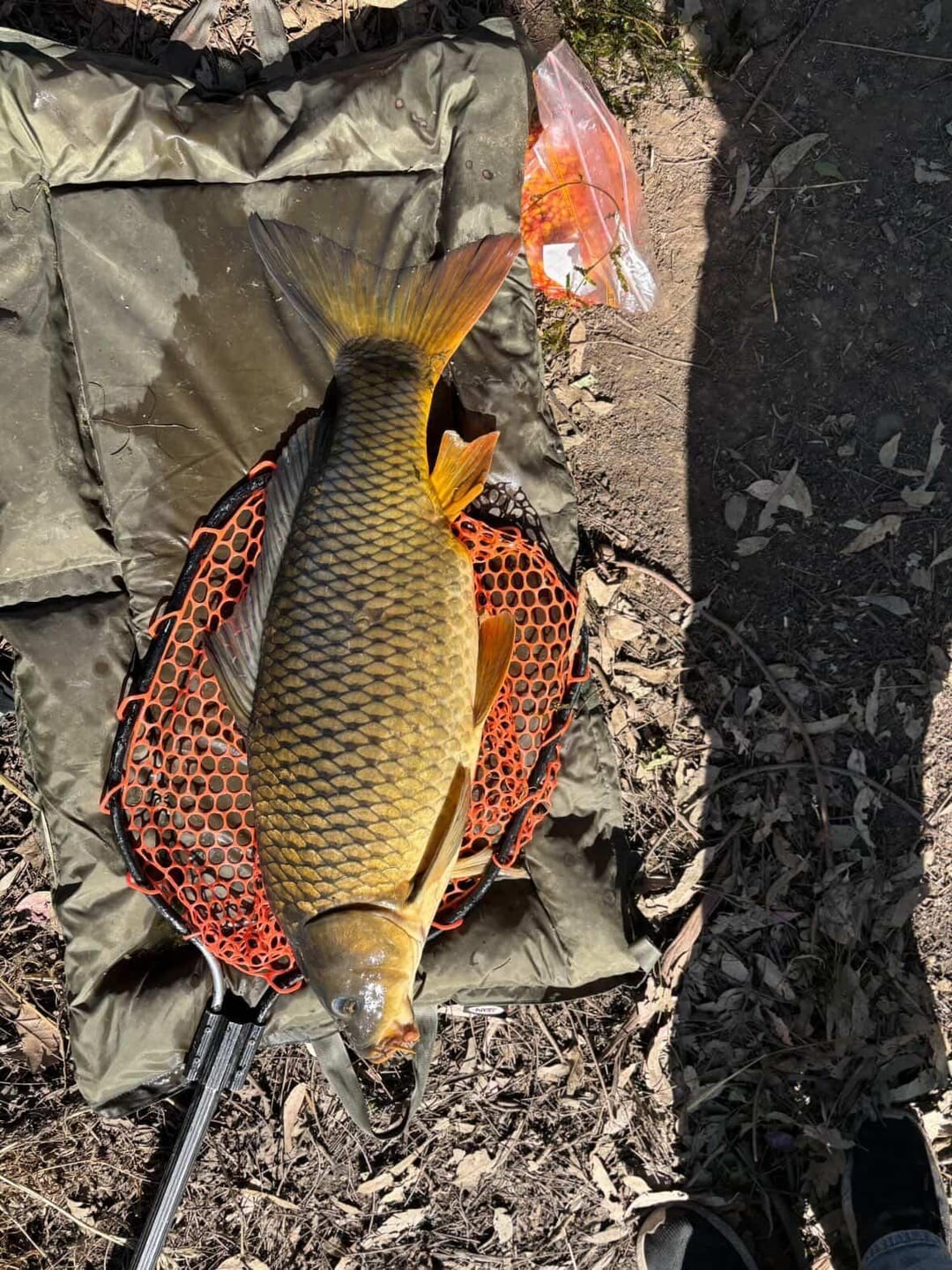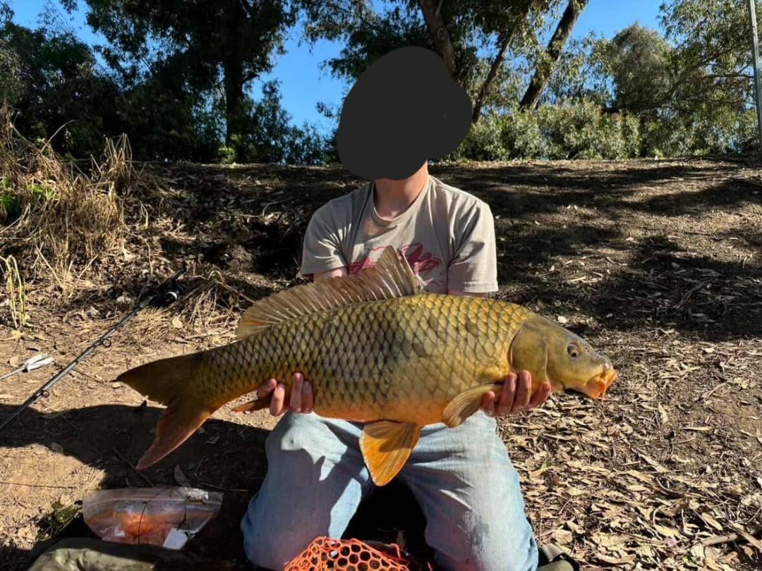 20lb female common on a size 4 hair rig no feeder just lead. Bait was sweet corn mixed with proline pro series boppin strawberry juice. Temu bait runner, Walmart brand rod, Walmart brand net, ngt beanie mat, no bite alarms just stands. Very close quarters beeps would spook them off.