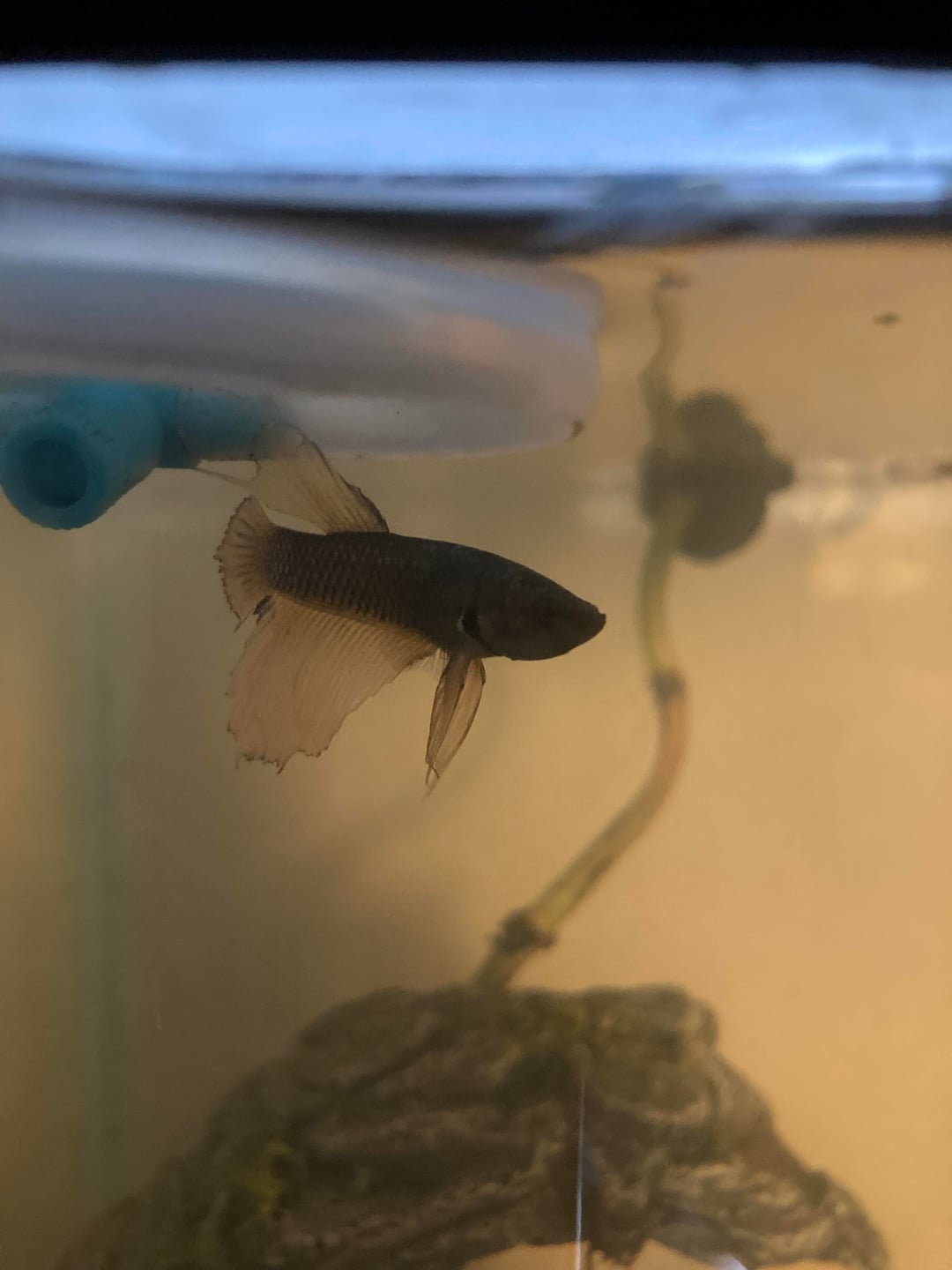 any name suggestions? sorry the quality is so bad🥺🥺🥺 i have him in a blackwater tank and the tannins are so dark i cannot see him very well<|3