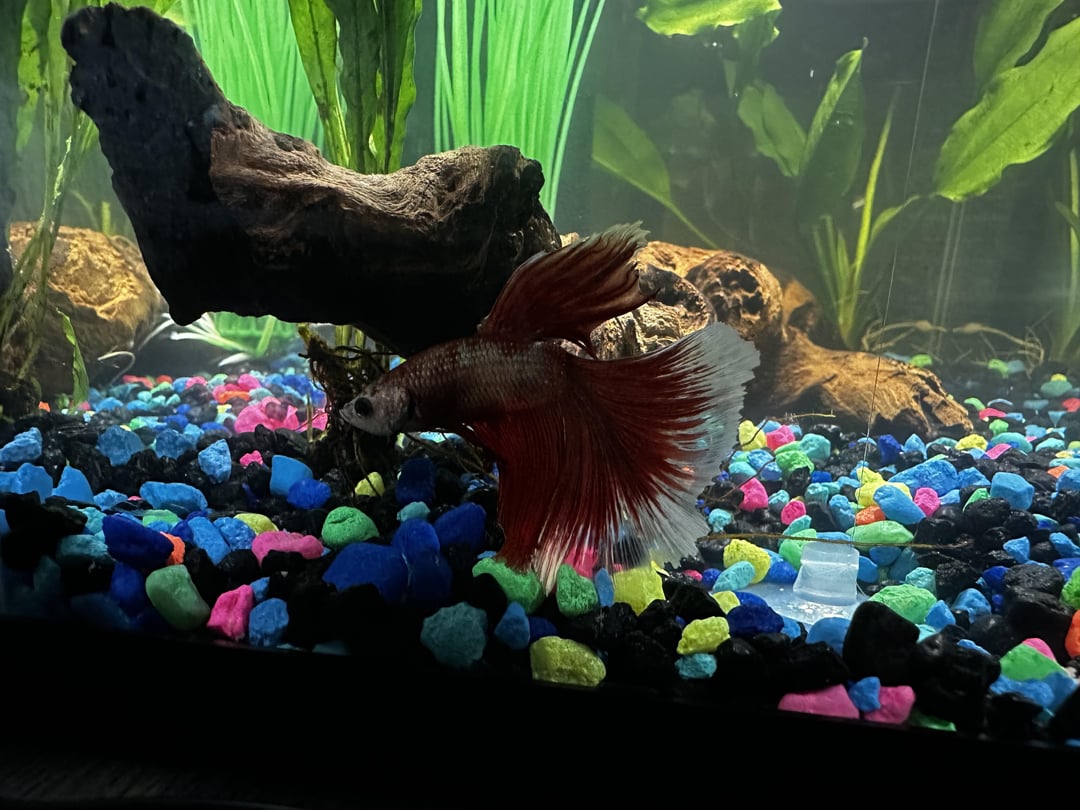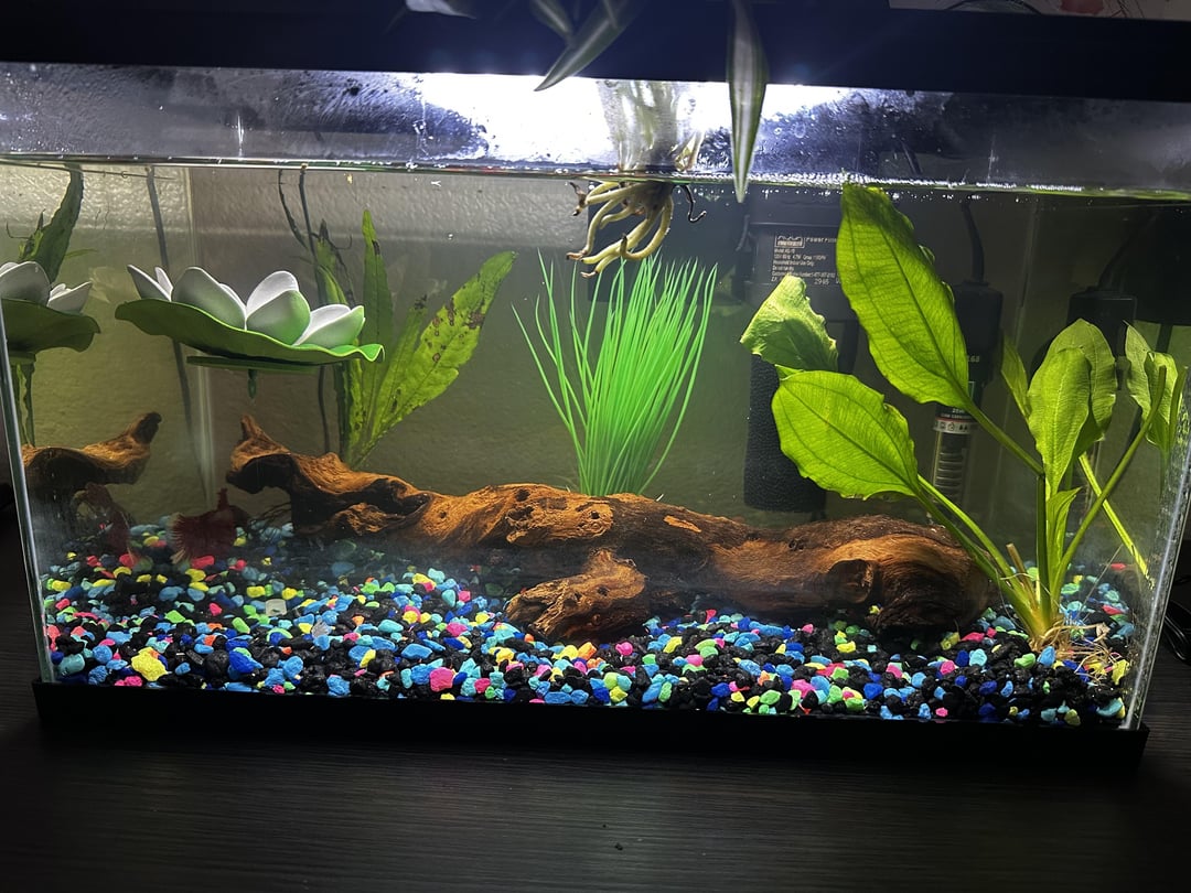 My 7 year old insisted on rescuing the saddest looking betta at petco while buying food for our guppies. It’s been a week and he’s still pretty sad and I’m not sure what else to do for him 🥺 any suggestions? He’s in a heated, filtered 5 gal tank with a couple live plants & mopani wood. It’s not properly cycled (I know, I know, But it wasn’t planned 😬) and I’m doing a proper fish-in cycle (I successfully cycled our guppy tank ahead of getting them, so I’m familiar with the process and am working from a guide). Help? Photos of Creepy Party Clown included.