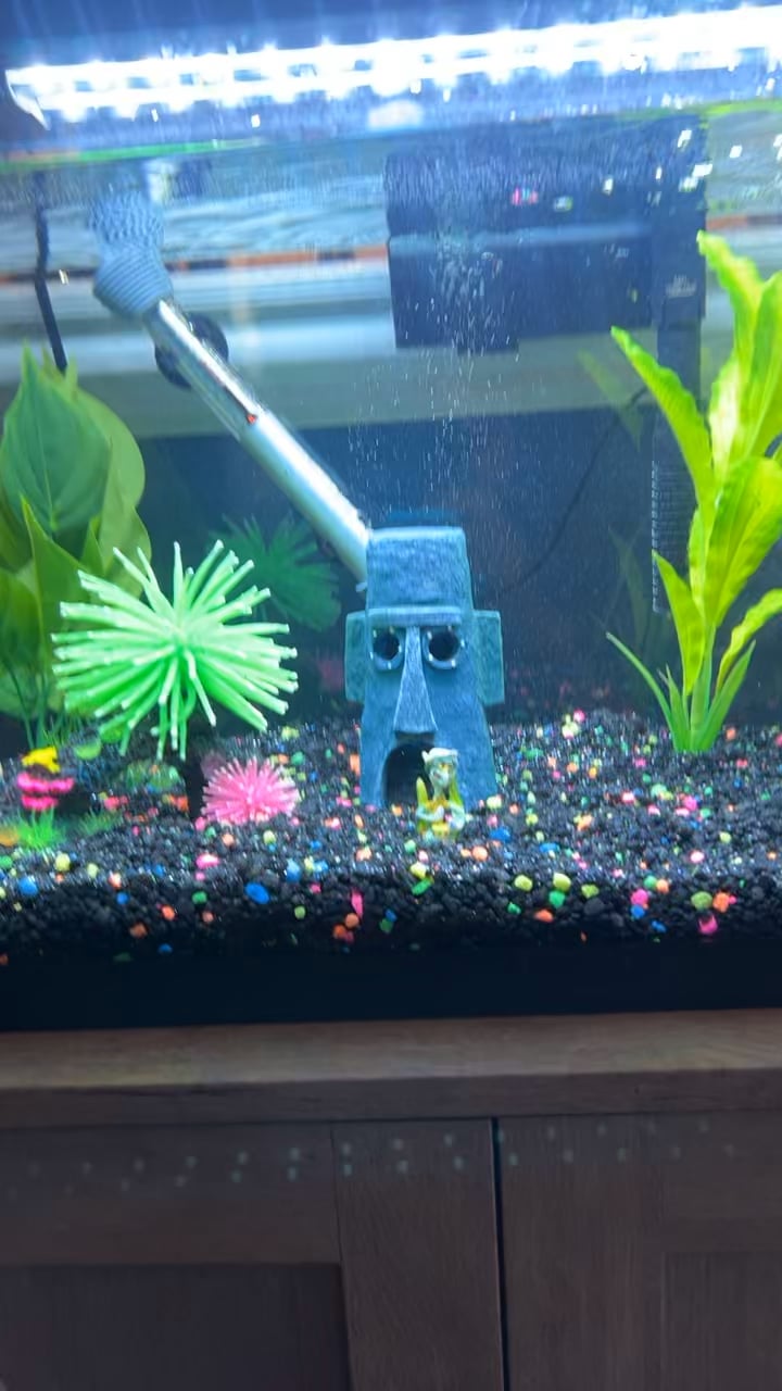 Fun!! If it’s a glass tank, melamine sponge (magic eraser) is the easiest to glean algae off the glass with.