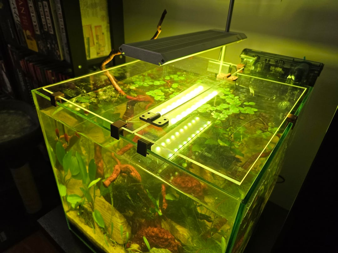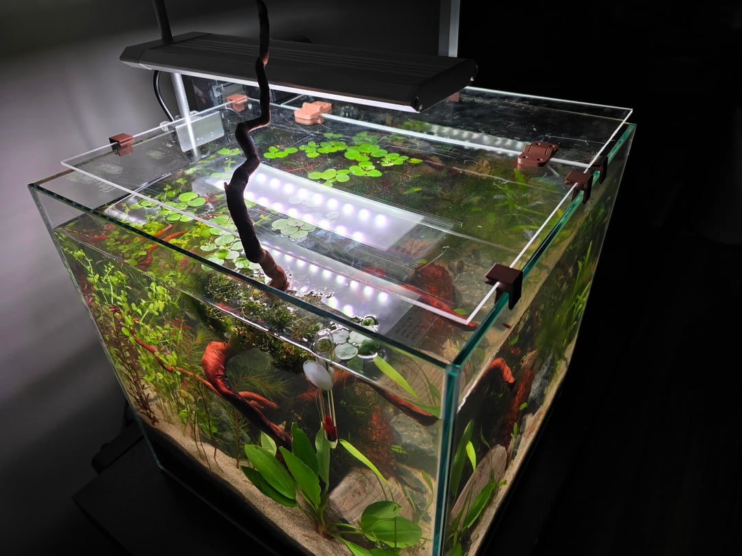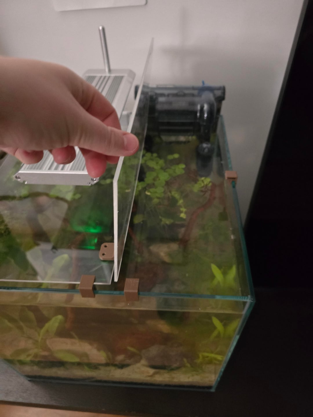I decided to get together a custom lid, that I could fit around everything and make it so that I didnt need to take anything off to feed my shrimp and do light maintenance. The filament is in my favourite colour and I love how it accents the driftwood, otherwise you could always order acrylic hinges and components online (i know aliexpress sells them).